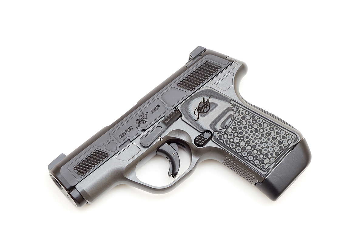 We received the Custom Shop (CS) version, which includes Stiplex-inspired slide serrations and a similar treatment on the frontstrap and G10 grip panels. The slide has attractive machine cuts on the top and sides to add to the pistol’s appeal. Additionally, the barrel has a deep crown. The frame wears a charcoal gray KimPro finish, and the slide has a ferritic nitrocarburizing (FNC) treatment for corrosion resistance. The CS version also sports upgraded Tritium Pro night sights from TruGlo. The pistol ships with two 7-round magazines with extended baseplates.