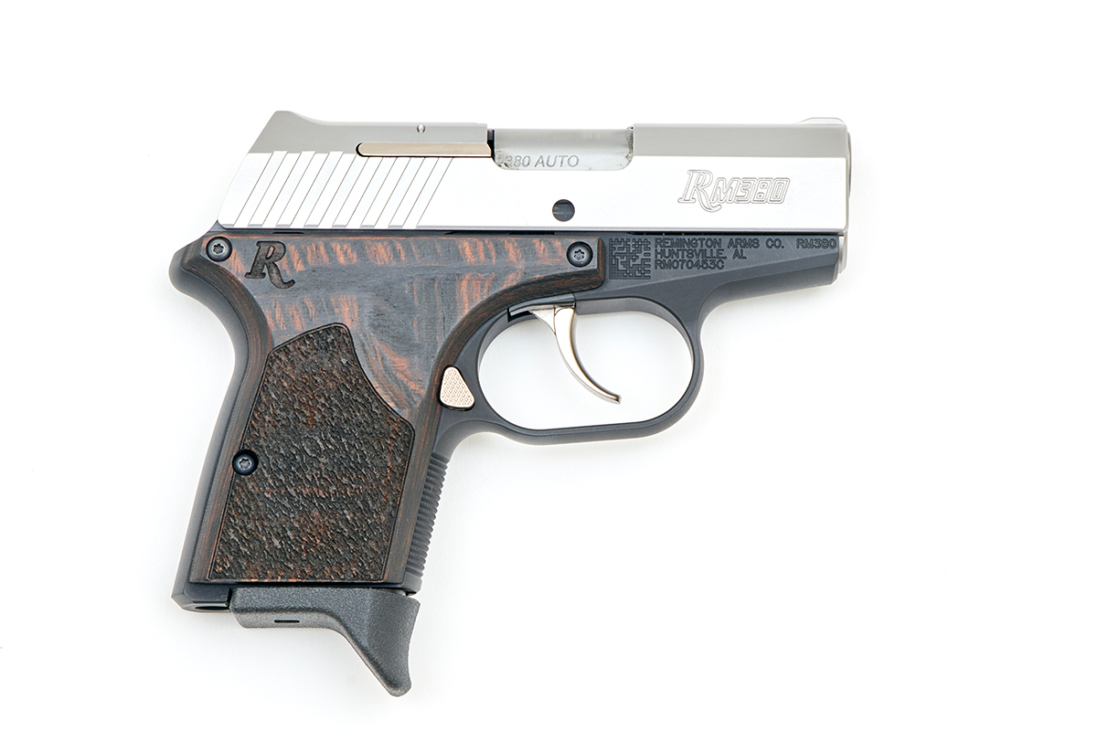 The smallest pistol in the test group was Remington’s RM380 Executive, which sports a stainless slide and laminate Macassar grips for a touch of elegance. The RM380 is a double-action-only (DAO) semi-automatic pistol that utilizes a locked-breech design and incorporates a bobbed hammer. It comes with a pair of six-round, single-stack magazines—one with a flush-fitting baseplate and one with an extended baseplate.