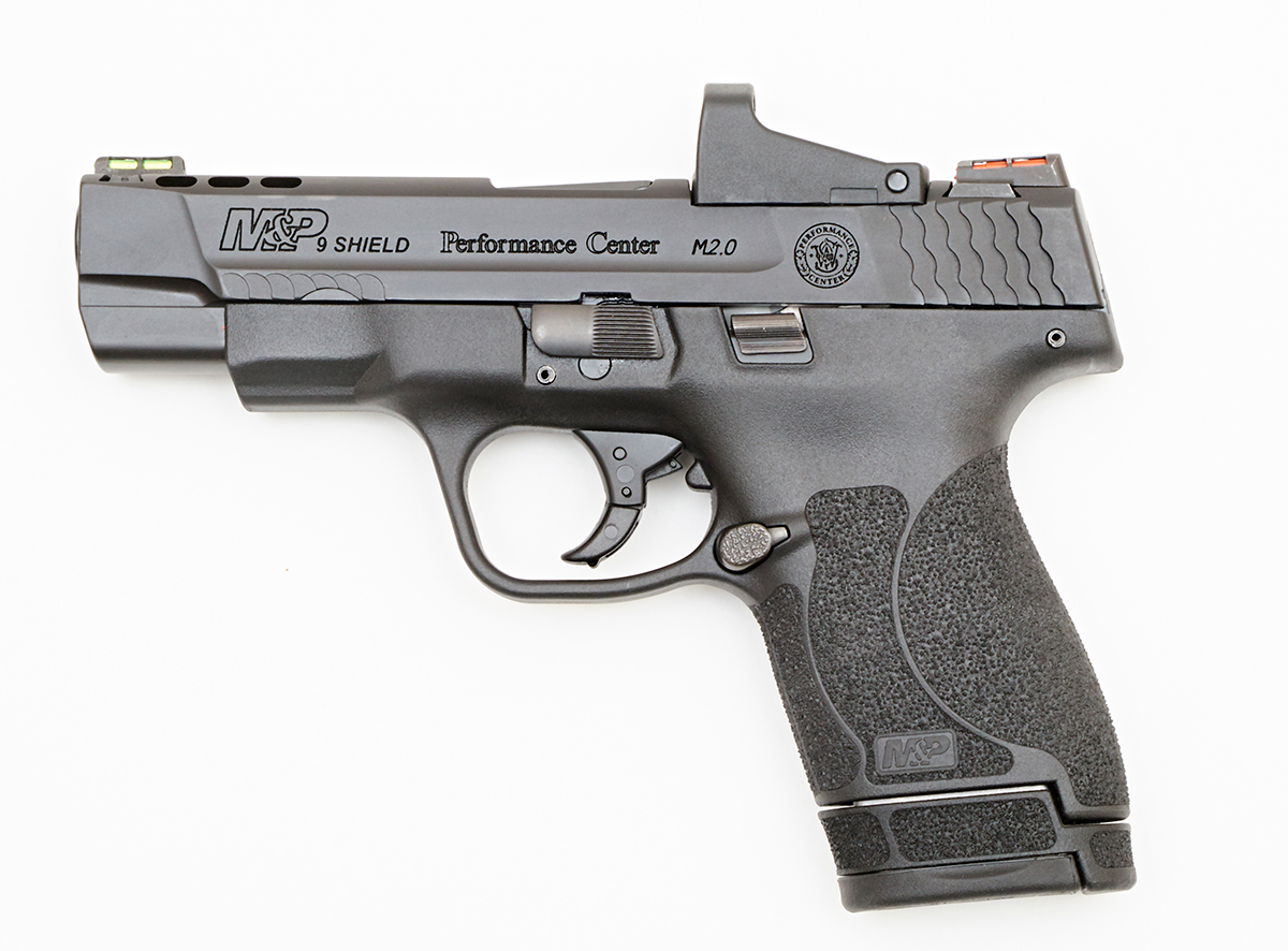 On the other side of the coin, we have the Smith & Wesson Performance Center (PC) M&P9 Shield M2.0 with a ported 4-inch barrel. Standard Shields typically come with 3.1-inch barrels, but with the barrel being the easiest part of a pistol to conceal, Smith & Wesson increased the length and kept the short frame of the original. This particular PC Shield also comes with a miniature reflex sight mounted to the slide, adding some height to the overall package.