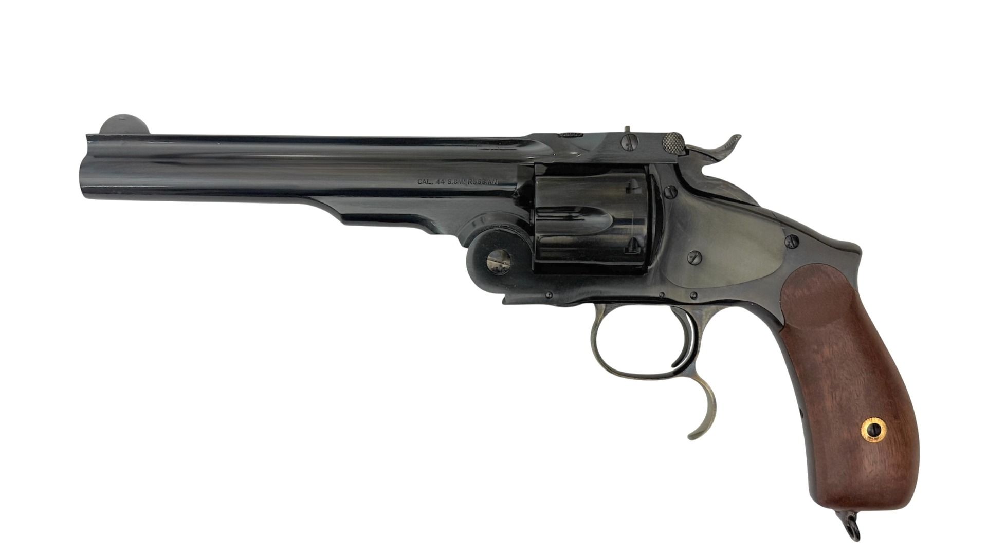 The test gun came with as blue finish, accented by color case-hardened parts such as the trigger guard and hammer. This hinged frame six-shooter is single action and when the top-latch is unlocked, it can be broken open, and the barrel pivoted downward to eject the spent brass, and load fresh cartridges. As the firing pin, which is made into the hammer nose, protrudes from the breech-face when at rest; the chamber under the hammer should be left empty for safety. The Model 3 Russian has smooth, two-piece walnut grips, plus a small lanyard ring in the butt of the grip-frame. Empty weight is 2.7 lbs. and overall length is 12.16 inches. It makes a great wheelgun for cowboy action shooters.
