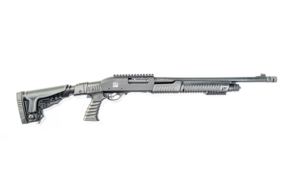 The 301 Pump Tactical was another economically priced shotgun that came packed with features. It has a folding, telescoping stock with adjustable cheek piece, a Picatinny rail with a groove down the center to act as a rear sight, a fiber-optic front sight and a Picatinny rail molded into the front of the forearm so you can mount a laser or light. The main downside was the magazine only holds four shells. It will almost take five but not quite, and I wish the gun had a magazine-tube extension to hold a couple more shells. The barrel is threaded for Beretta/Benelli Mobil Choke tubes and comes with Improved Cylinder, Modified and a breeching tube that has teeth to dig into a door and ports to let gasses escape out the sides.